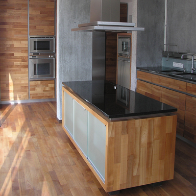 Küche für eine Familie, offen zum Flur- und Essbereich mit Theke